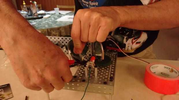 Tira un cable de alimentación de 5 voltios, retire las pilas del láser e Introduzca el extremo pelado el láser por lo que hace contacto con los resortes de la batería. Nosotros sólo conducto grabado el botón de encendido del láser hacia abajo, atado con ataduras de cremallera y dirigido al espejo vertical.