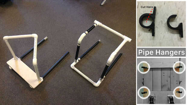 Hicimos algunas variaciones de los soportes de la bandeja fuera del tubo de fontanería de PVC de 1" y uniones T y 45/90 grado estándar. Las longitudes y configuraciones dependen del tamaño del niño y apoyar a cualquier alojamiento específico para conocer las limitaciones de movilidad o el cuerpo. Un soporte de bandeja se utiliza para el controlador de dispositivo que permite que se utilizará para la entrada de direccional a la cesta de la ayuda. La estructura de PVC está conectada al carro con los titulares de la tubería modificados para permitir un ajuste de fricción. Esto permitió un accesorio relativamente fácil y desprendimiento de la cesta para permitir la entrada en el asiento del coche. Hemos añadido un reposapiés para niños más grandes o para conectar una entrada de pedal de pie en uno de los soportes de la bandeja de PVC.