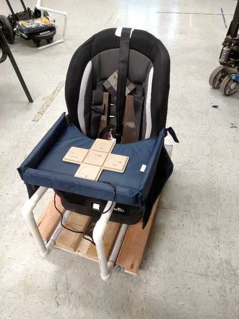 Utilizamos viaje bandeja infantil como base para apoyar los interruptores de control. Se trata de una bandeja pequeña y ligera que está diseñado para montar en un asiento de coche, así que satisfizo nuestras necesidades para el entrenador. Una alternativa es fabricar una bandeja y montar permanentemente en el marco de PVC