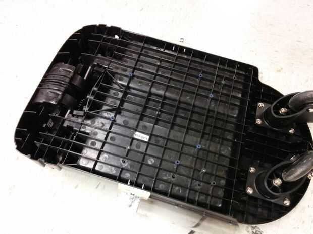 La construcción del entrenador es similar con la tienda del bebé pero con el aumento de los costos. El crucero de bebé ofrece asiento accesorio correas y un asa para asistirle en el manejo y moverse el entrenador. Para configurar la tienda del bebé como la plataforma, se deben quitar las ruedas traseras y la plataforma de madera contrachapada (con motores, controlador y batería) debe ser atornillada en la parte inferior de la tienda de bebé. Una vez que se quitan las ruedas posteriores, utilice tiza o un lápiz de cera para cubrir los orificios existentes en la parte inferior del crucero (como se muestra). Presione la madera contra la parte de abajo para transferir la ubicación de los orificios. Estos pueden utilizarse para efectuar la madera contrachapada para el montaje. Apriete a mano los tornillos para evitar dañar el plástico.