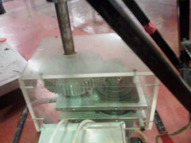 Posteriormente, diseñaron una placa base que la caja de control del sistema de accionamiento. Los engranajes y motores atados a la columna central de la silla para girar la silla.