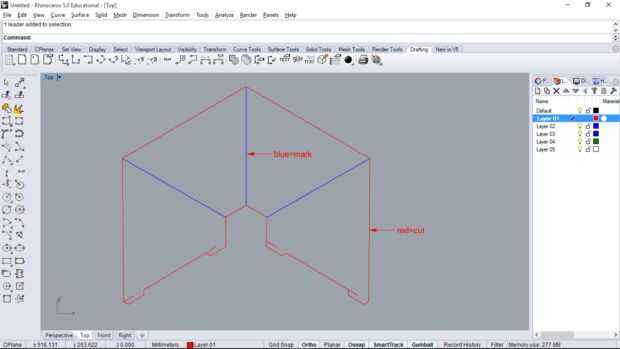 El archivo DXF muestra donde tienes que cortar (rojo) y simplemente márquelo para doblar (azul). Utilice las configuraciones de potencia y velocidad de láser generalmente para una hoja de acetato fino.