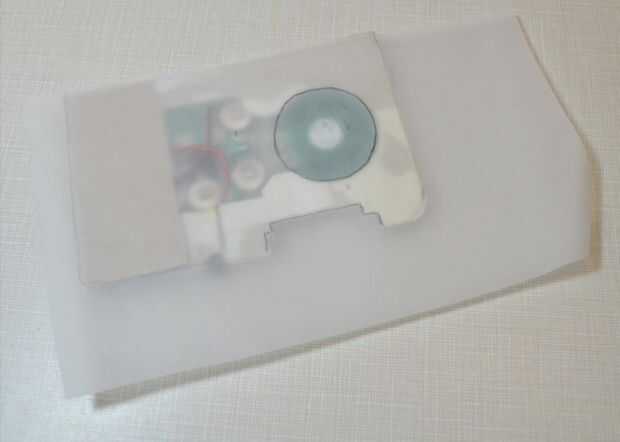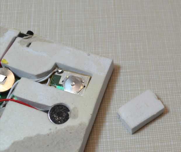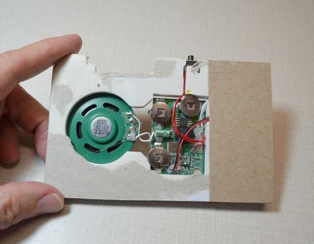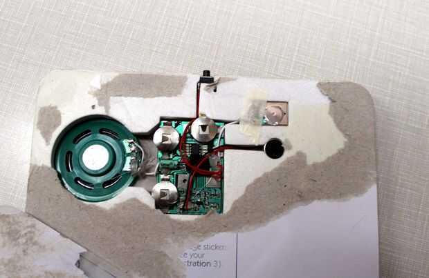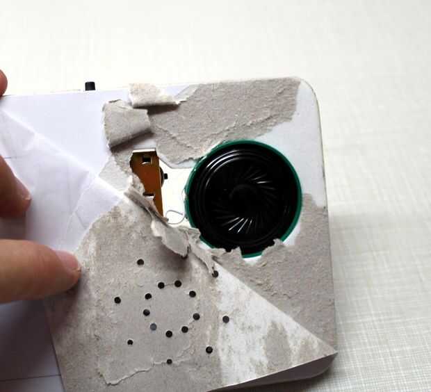 -Con cuidado retire el papel del dispositivo de sonido del cartel, revelar los componentes. Este paso revelará el compartimiento de pilas para su uso posterior y también permitirá un refuerzo a ser agregado detrás del botón.