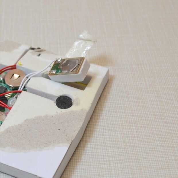 -Levante suavemente el botón de grabación de la base de espuma. Quitar espuma forro del componente y muy suavemente la meta nuevamente en su lugar. Corte un pedazo de cartón delgado para caber sobre el botón de grabación y el micrófono y sujételo con cinta de pegar. Queremos asegurar que no accidentalmente borrar nuestra grabación, pero que seguirá siendo capaces de cambiar en el futuro si, digamos, nos enfermamos de tener la misma canción que pegó en la cabeza durante semanas.
