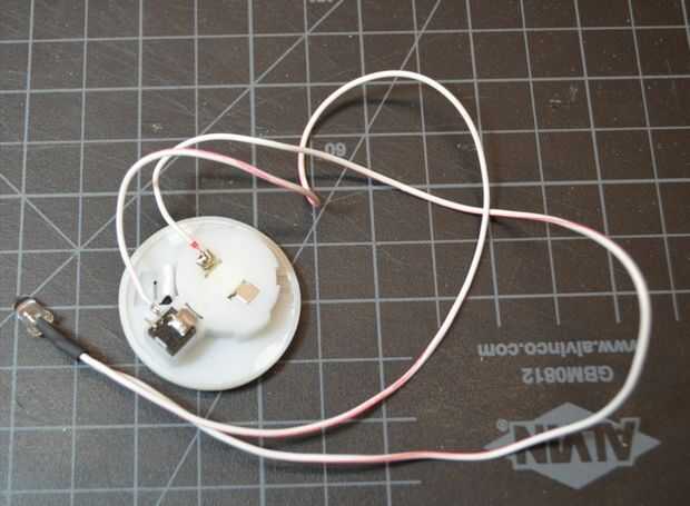 -Reemplace los cables de la luz del té con cables más largos. Tenemos los hilos que hasta desde el otro lado del sándwich, así que pegue una pieza de refuerzo de madera detrás de la luz del té, así, dejar seco y caliente pegamento en su lugar.