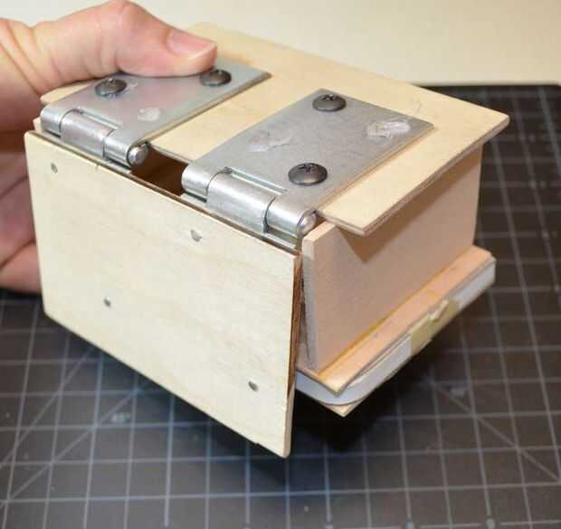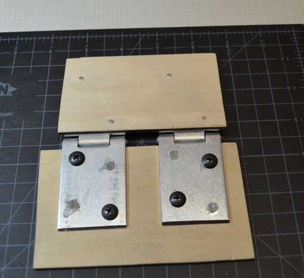 -Otra vez utilizando el componente superior de su mofa de la caja como patrón, cortar la pieza superior de la caja de madera. Coloque las bisagras en esta pieza y añadir otra pieza del mismo tamaño al lado opuesto de las bisagras. En este caso, he utilizado contrachapado de abedul de 1/16". Asegúrese de que la bisagra oscila todavía como se supone que, luego pegar la parte superior con bisagras en los lados. Debido a que utiliza madera fina, coloqué la bisagra en la parte superior la madera en lugar de ya que fue diseñado (a ambos lados de la bisagra oculta) así que habría menos tensión en la madera y la bisagra de colgar todavía se movía libremente.