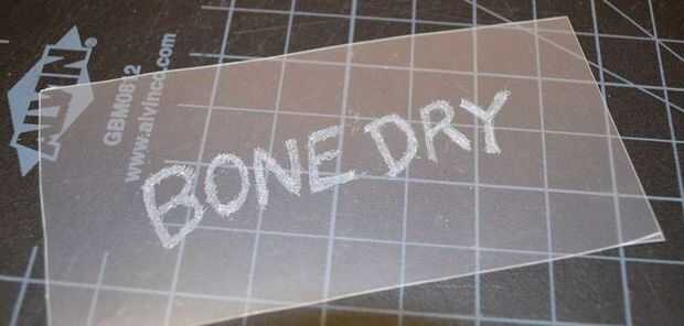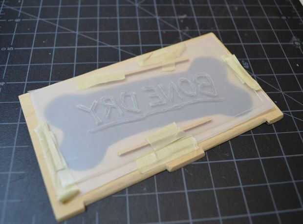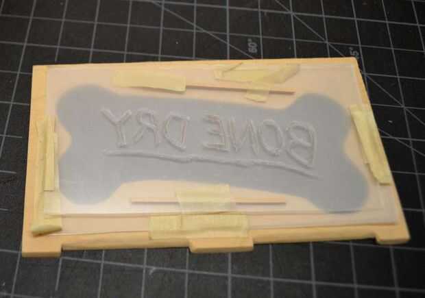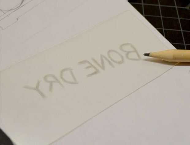 -Coloque la segunda pieza de plástico sobre el patrón de hueso y con su cuchillo o una aguja o un archivo, rasguño sobre la inscripción para transferirlo a la plástica. No presione demasiado, queremos que el deletreado rasguñado en el plástico sin abollar la superficie. Sigan rasguñando en un patrón cruzado de la portilla hasta la inscripción es claramente visible cuando el plástico se coloca sobre una superficie oscura.