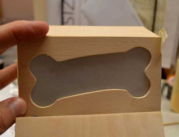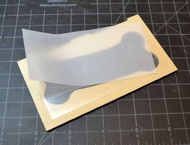 -Cortar dos trozos de plástico transparente para dentro de 3/16" o menos de los bordes de la pieza frontal de la caja de iluminación (lo suficientemente grande para cubrir la ventana, lo suficientemente lejos del borde exterior para permitir que la pieza frontal encolar en su lugar). Cortar un trozo de papel del mismo tamaño que el plástico. Con cinta de enmascarar, cinta de una sola pieza de plástico en la parte posterior de la pieza frontal y cinta su hoja de papel de calco sobre eso.