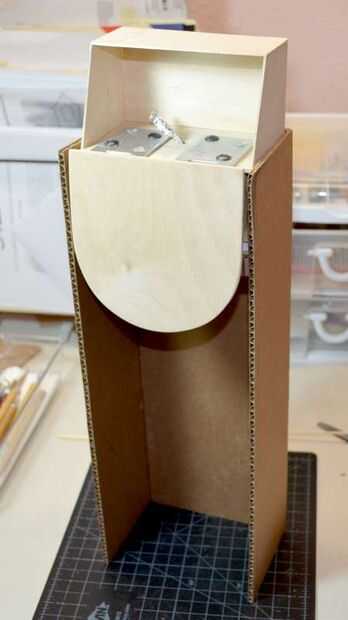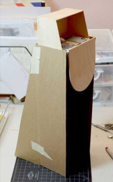 -Crear una maqueta de cartón de su base. Básicamente, consiste en un apoyo recto y dos lados, con rieles para mantener la porción de emparedado de la casilla de activación. El primer diseño fue una simple torre, pero cuando tuve Cody probarlo, por supuesto acaba derribado lo. He añadido el respaldo inclinado para que sea más estable. Tienes que dejar el frente abierto para amplificar el sonido. (aunque no es muy ruidoso en el vídeo, la grabación es bastante ruidoso - al menos lo suficientemente alta para ser oída en habitaciones cercanas donde normalmente pasamos nuestro tiempo, pero tenemos la luz como una copia de seguridad si te lo pierdas)