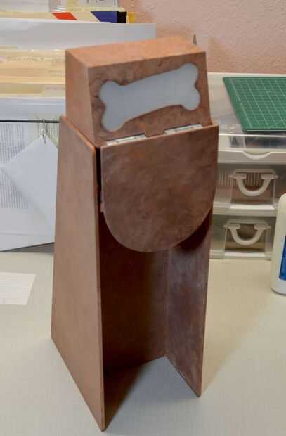 -Utilizando sus piezas de cartón como patrón, cortar madera y armar la base con pegamento de madera. Usé 1/8 tablero duro, pero si hubiera tenido 1/4" madera contrachapada o tablero duro habría utilizado como hubiera sido un poco más pesada y más resistente. Otra vez, tomar en consideración el tamaño de su perro y lo difícil podrían golpear el dispositivo. Los rieles son basswood tira 1/4" y 1/8".