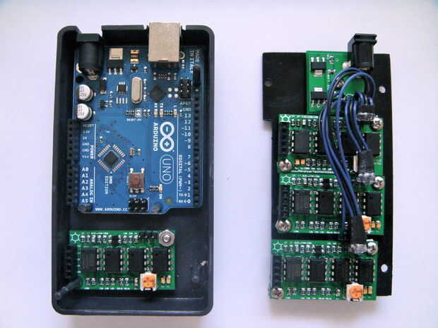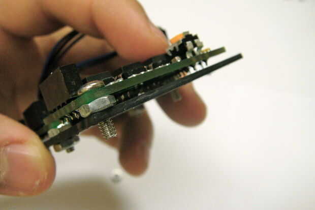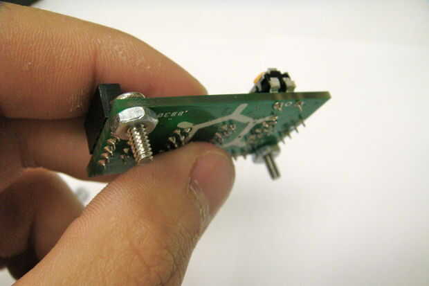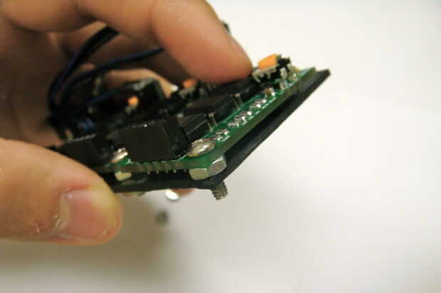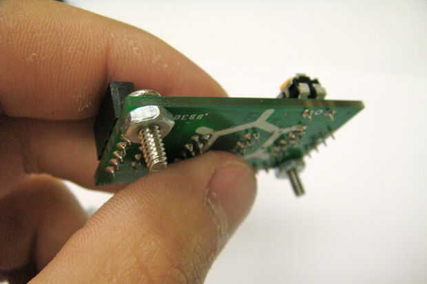 A continuación, coloque el tornillo de montaje de cada sensor en cada orificio de montaje correspondiente. Recuerde que debe mantener los sensores musculares' headers hembra en el mismo lado como desplazamiento de la plataforma. Pase otra tuerca en cada tornillo hasta que estén bien y apretado. Más apriete con un destornillador y una llave, sosteniendo la segunda tuerca seguro.