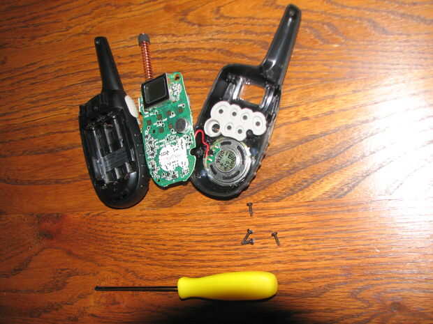 A continuación, abrir las radios. Pasar algún tiempo con sus interiores. llegar a conocerlos. Tal vez los saca de una buena cena o un paseo en la playa. La soldadura con cuidado el altavoz en uno, y el micrófono en la otra. Arrancó los alicates, que en retrospectiva fue un riesgo estúpido, y tuve suerte que no pasó nada malo. Tome nota de los contactos en el circuito donde habían estado los componentes. Que va a utilizar esos contactos más adelante. Mezcle el altavoz y el micrófono en su cubo de piezas de repuesto.