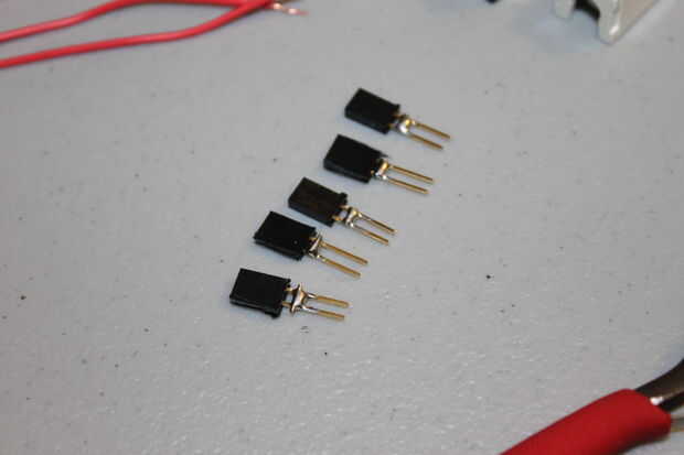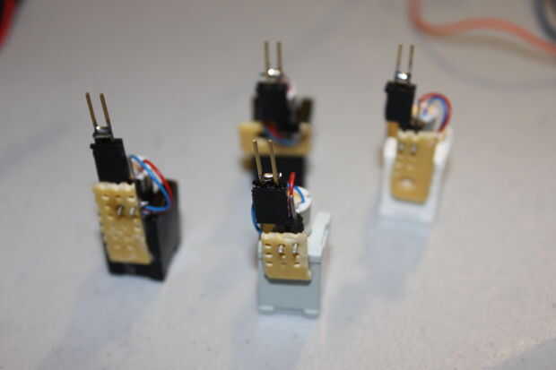 3 - cortar los headers hembra en pares de 2. Se trata de enviar 5V común a los motores siguiente y anteriores.