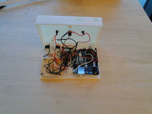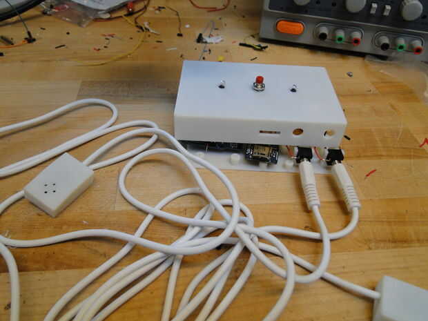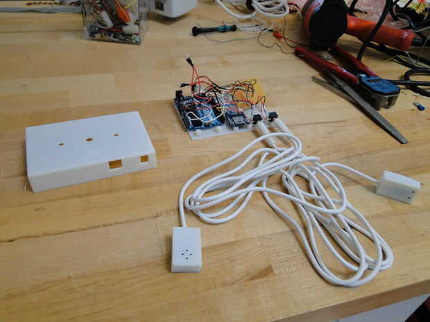 Desnudó uno de los extremos de cada cable de audio y utiliza los tres alambres internos para conectar salida, GND y VCC de cada micrófono para Arduino. Una vez que los componentes todas funcionaban correctamente, montara todo dentro de la caja con una combinación de tornillos y pegamento. Vero White no es el mejor material para tornillos pero funciona lo suficientemente bien como para un prototipo.