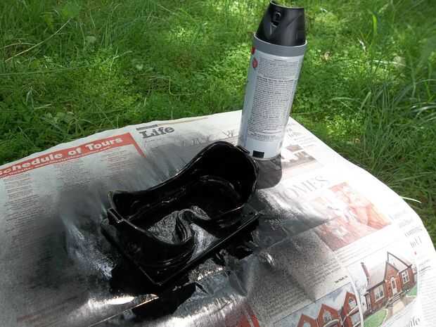 Finalmente, cortar las lentes de las gafas y consolidó la parte externa de la tapa de la caja más grande con una forma similar corte y aerosol pintado las gafas y tapa negra. Utilicé una pintura negra mate para esto para que coincida con el resto de mi recinto.