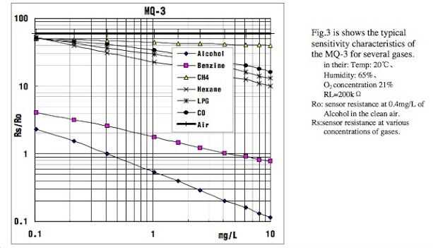 El sensor está compuesto por un micro tubo cerámica AL2O3, dióxido de estaño (SnO2) capa sensible, medición de electrodos y el calentador están fijados en una costra de plástico y red de acero inoxidable. El calentador provee condiciones de trabajo necesarias para el trabajo de los componentes sensibles. El MQ-3 sobres con 6 pines, 4 de ellos son utilizados para obtener las señales y otros 2 se utilizan para proporcionar calefacción actual.