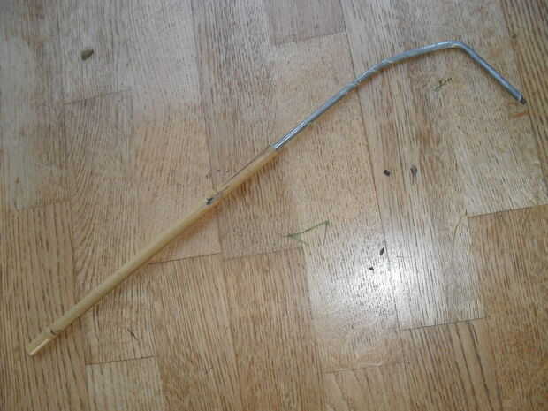 la barra de vino de una impresora vieja una vez demolido. debido a muchos años de poner en algún lugar, reunión de fuerzas desconocidas ya doblar un poco (la pequeña curva). la curva grande, segundo que hice poniendo en un vicio, y doblarla la manera correcta, por lo que todavía ser plana cuando se pone en el piso. es un poco de sendero y el error, el mío es poco más de 90 grados con el resto del eje (también conocido como la parte de bambú) así saldrá la flecha si la encontró.