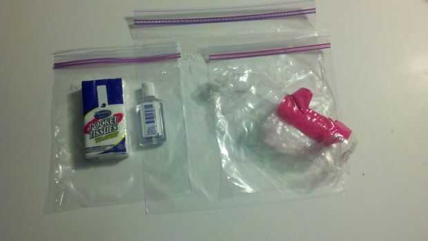 Una bolsa de ziplock para el papel y handsanitizer (botella pequeña).