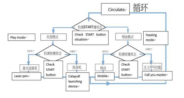 Cambiar entre los dos modos (modo de reproducción, modo de alimentación) haciendo clic en el botón "Inicio". En cada modo, ajustando el botón, el dispositivo mostrará funciones caracterizadas como láser pluma interacción, alimentación, plataforma móvil, llame a su maestro por MP3 y etc..
