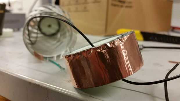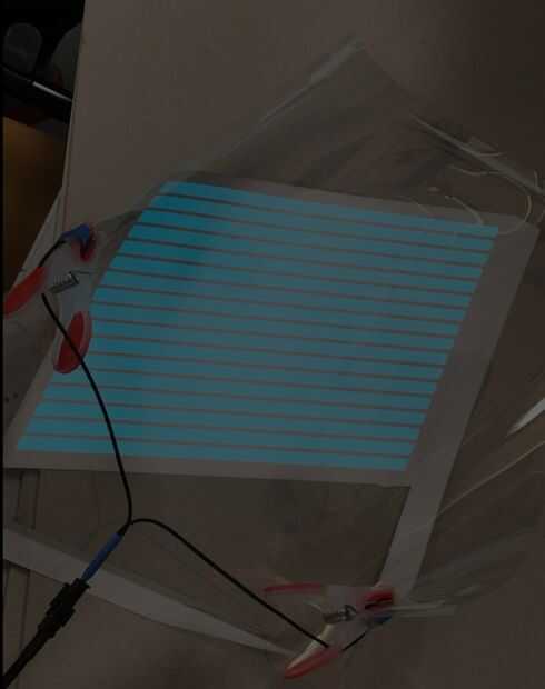 Si funciona, la hoja de ITO está lista para ser cortado. Esta hoja de ITO debe ser cortado en forma de Z y algunas líneas diagonales independientes (entre los caminos de fósforo). Entonces la hoja de ITO puede ser envuelto, como un cilindro y los extremos de la forma Z pueden ser pegados. Pegar dos pegatinas de cobre en ambos extremos del cilindro en el interior (uno en la hoja de ITO y uno en la capa de plata).