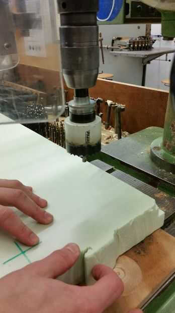 Ahora, el objeto electroluminiscente está acabado y dos cilindros de apoyo pequeña pueden taladrarse fuera de un material de espuma. Además, perfore un agujero en el punto central de ambos cilindros. En el exterior de los cilindros una pegatina de cobre debe aplicarse así. Esto permite el poder ser transferido de los cilindros pequeños sobre el objeto electroluminiscente. También, un cable es enlazado a través de los primeros cilindros pequeños y atado en la cáscara externa del segundo cilindro pequeño que se coloca en la parte superior del objeto EL.