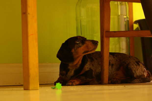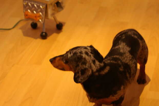 me encantaría decir que mi perro amado este dispositivo justo al lado del palo, él no. El aspecto pavloviana detrás de esto aunque realmente funcionaba. Cuando le pongo primero la máquina, corrió hasta un esnifan, que huele la trata dentro. Cuando activa sin embargo, el sonido le hizo saltar hacia atrás. Por supuesto una vez vio el convite correteando por el suelo él superó su miedo y persiguió después de él. Pero de ahí en adelante permaneció alejado de la máquina. Cada vez que él estaba en la cocina pidiendo para dramáticamente caminaba sobre los restos a la máquina, agacharme y empuje la paleta con la mano. skitter Ka-pedazo-brazzzat - y su tratamiento a través del suelo. No fue hasta varios días más tarde en medio de la noche me despierta el sonido repetido de la máquina que se apaga en la planta baja. Cuando se escapó en la planta baja, su Maximus establecen rodeado por un montón de golosinas, mueve su cola como un loco y me dando un aspecto poco orgulloso de algo. ¿Por supuesto haría esto a la cámara? por supuesto que no - oh la frustración... Verás, Max siempre ha sido así con cámaras, en cualquier momento uno se apunta en su dirección él subirá a usted y voltea de espaldas a su vientre acariciaba. Las fotos que recibió de él para este instructable debía ser concertadas previamente con mi esposa haciendo un poco sutil distracción. Tal vez debo hacer otro instructivo, la primera "dachshund cámara ciega"