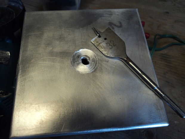 - Primero perforado corte mi agujero en la tapa de la galleta de perro tubo tolva. Ahora decir "corte" porque descubrí la broca que estaba usando estaba doblada un poco. Basta con decir causó un bamboleo y ahora se deforme el agujero del centro. Acabó el orificio con una sierra de calar y Sierra fina de metal.