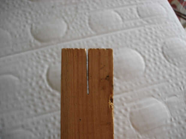 Usted tendrá que hacer dos ranuras como se indica en las fotos anteriores. Utilicé una sierra de arco para eso porque tiene una hoja delgada.