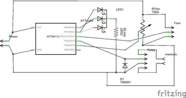 Interpretar la secuencia de pulsos del sensor utilizaremos un microcontrolador ATtiny85, esto va a contar los pulsos y cuando se consigue el caudal deseado se cierra un relé, completando el circuito de enclavamiento.