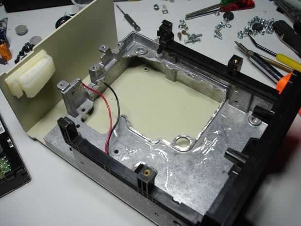 a uno con la caja abierta.) Lo que se muestra es la caja abierta, destripado, y una porción del aluminio inferior corte que nos dé más espacio. Tuve que cortar la parte de aluminio de porque se fue levantado y el motor paso a paso que hacer girar los discos. Los dos cables que ves es de la actividad rojo original ("en uso") LED en la parte inferior izquierdo esquina de la parte delantera de la unidad.