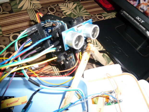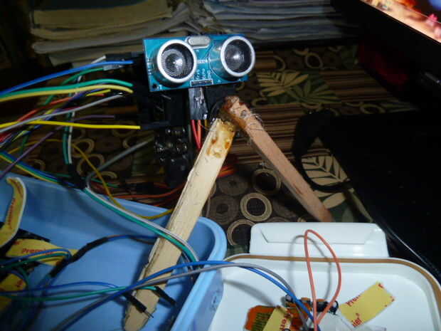 En este proyecto, a crear un Robot insecto que camina hacia adelante en cuatro patas. Uso de la ecografía, el robot puede ver en la oscuridad, al igual que un murciélago. Cuando detecta un obstáculo, lleva unos pasos, vueltas y sigue adelante. El robot puede caminar sobre obstáculos pequeños, y parece más humano que sus parientes con ruedas.