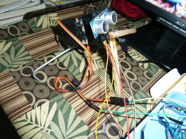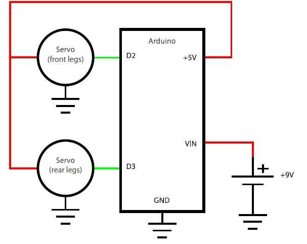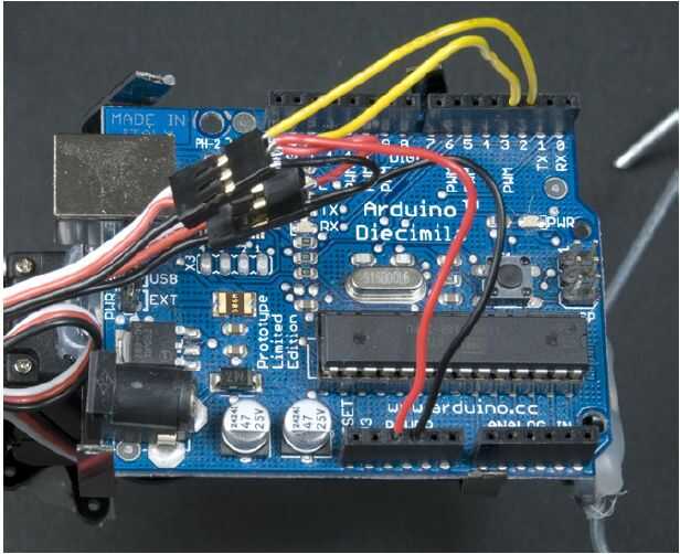 Conecte el servo a la Arduino atando el alambre negro del servo a cualquiera de los pines de Arduino GND. El cable rojo indica voltaje positivo; conectar al Arduino + 5V pin. Los datos de color blancos o amarillos del alambre controles servo; lo conectas a uno de los pines digitales. Para este proyecto, conecte el cable de datos con el primer conector digital disponible: pin digital 2 (D2). Figura 4-4 muestra la conexión, y la figura 4-5 muestra el esquema.