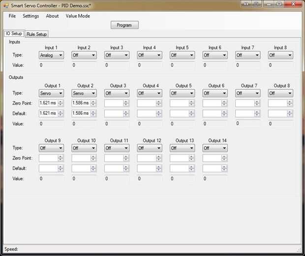 Establecer salidas 1 y 2 en servo. Establece el valor predeterminado y punto cero para que el motor del servo no se mueve. Utilizando la herramienta de selector de valor (Ctrl-Click) esto hará más fácil. Mover el deslizador selector arriba y abajo hasta que el servo detiene.