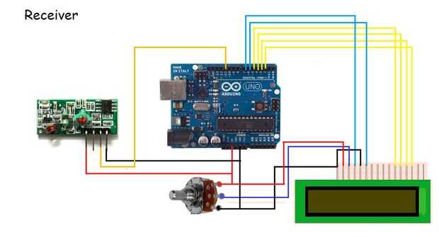En este paso se requiere un arduino UNO, receptor 433 mhz, pantalla de LCD de 16 * 2, potenciometro de 10 k, un protoboard y algunos cables de puente masculino. Para hacer que el receptor sólo tienes que seguir los esquemas anteriores.