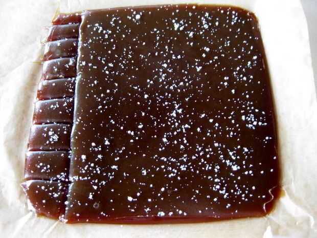 Vierta el caramelo en la bandeja para hornear forrada con pergamino. Deje que el caramelo se enfríe durante 20 minutos y espolvorear generosamente con flor de sal.