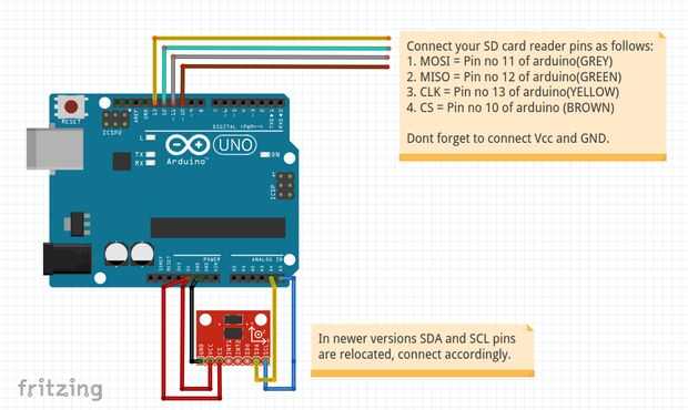 - Conecte los pines Vcc y GND del lector de tarjetas SD al pin 5V y pines GND de arduino duomilanove/UNO.