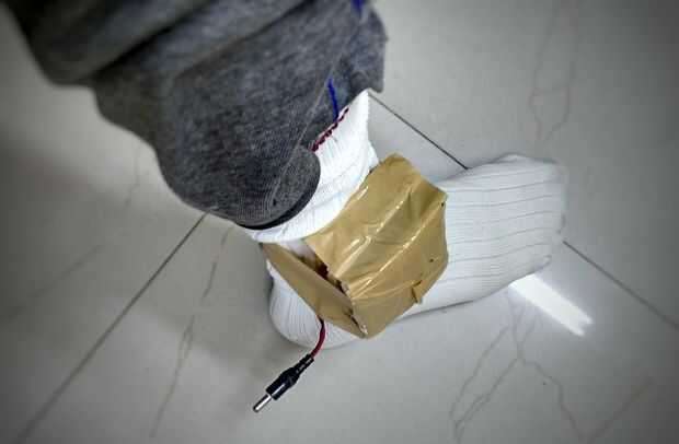 En este paso se coloque los dispositivo cerca del tobillo de obtención de datos y recopilar los datos. Pequeña cantidad de preparación se necesita para asegurarse de que no lastima a su uno mismo de los bordes del soporte de la batería, proyecciones afiladas de placa arduino o breakout.