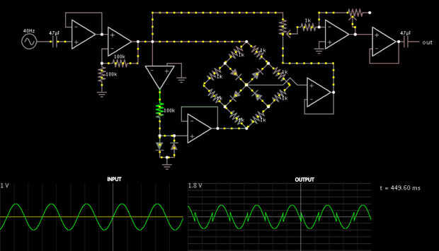 La onda cuadrada y la señal original que sale de la x2 etapa del amplificador son ambos alimentan en el modulador de Cruz *. Esta parte del circuito multiplica las señales de entrada dos juntos (multiplica en el dominio del tiempo, o convolutes en el dominio de la frecuencia) para producir formas de onda extraña, como puede verse en la segunda imagen (la simulación de este circuito y los esquemas fueron creados en el subprograma increíblemente impresionante de Falstad simulador de circuitos analógicos, http://www.falstad.com/mathphysics.html).