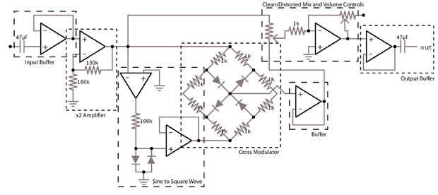 Este Loco señal y la señal original (de la x2 amplificador) entonces se combinan mediante un potenciómetro (el control del 'Mix') y enviada a un amplificador de salida (cuyo volumen de salida se controla con el potenciómetro de "Volumen").