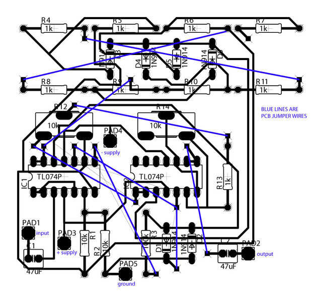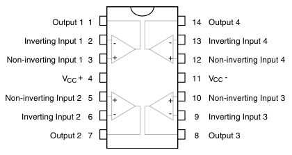 Le recomiendo que use op amp tomas en el montaje de este circuito; Cuando pones el amp op en las tomas en este PCB, los marcadores deben hacer frente a la resistencia de 1 k. El diagrama de pines de las fichas del TL074 también se muestra aquí para su conveniencia...
