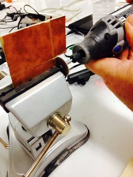 La placa de cobre de la cerradura en la mordaza de mesa. No olvides tu equipo de seguridad! Corte con cuidado la junta con la herramienta Dremel. Lo anotó la superficie de cobre para hacer una línea recta y luego volví para terminar el corte.