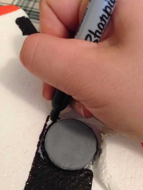 Usé un rotulador para añadir los detalles más pequeños y la mayoría de las zonas naranja del esquema. Tenga en cuenta que sharpie u otros marcadores base de alcohol va a comer por el poliestireno ligeramente, como sólo se utilizar en áreas más pequeñas que no debería ser un problema.