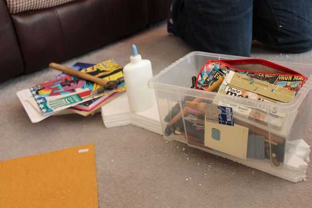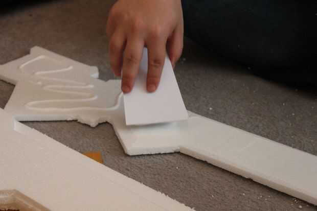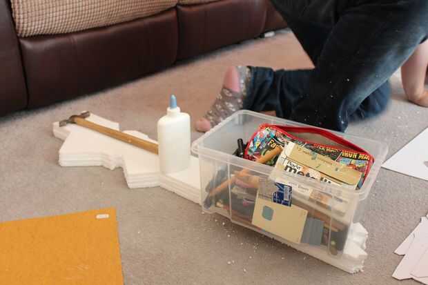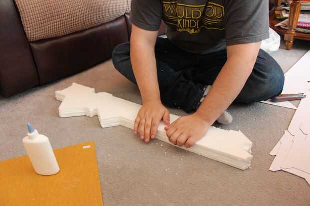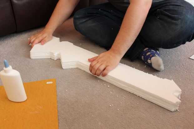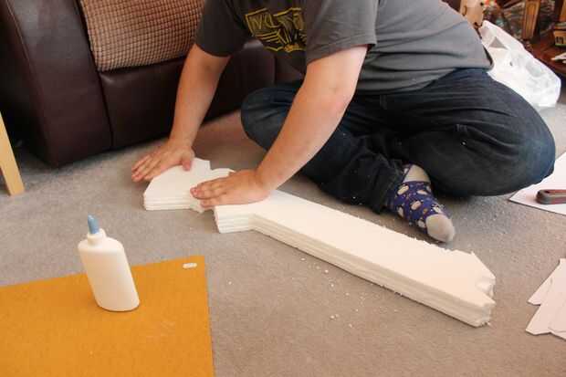Unir las 2 piezas más grandes y luego pegar las 2 piezas menores a éstos, alineando como mejor puede. Una vez pegado, pesaje hacia abajo las piezas de espuma para evitar que se mueve. Deja durante la noche o hasta que el pegamento se seca.