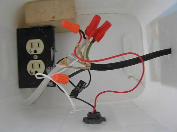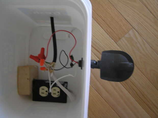 Primero corte dos agujeros en su gran recinto estanco (caja de la litera del gatito) uno para el sensor de movimiento y otro para la línea. donde se ponen depende de usted. Instale el sensor de movimiento en el agujero con el sello de la cubierta apropiada todas las grietas con la silicona. hacer lo mismo con la línea de alimentación. (ver imagen abajo) conectar los cables apropiados uno al otro (alimentación al sensor).