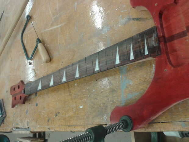 Siguiente paso es simplemente siga las instrucciones (pasadas o futuras) relativos a aplicar el mástil a un cuello ya sea este instructable o la construcción original. Tal vez, sólo tal vez, usted podría incluso mirar de otro trabajo también.