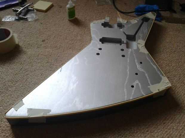 Para reventar, necesitarás buena puntería y una mano firme y la falta de viento. Ver otra vez: mi Explorer para un ejemplo de él mal. El truco es apuntar el centro del spray 'cono' de pintura pasando el borde de la guitarra. Es un desperdicio de pintura, lo sé, pero es la forma más efectiva de hacerlo que me he topado. Otra vez no te preocupes que no es aún suficiente en la primera capa, va a ir sobre ella en un poco. un día entre los 15 minutos entre las capas, colores.