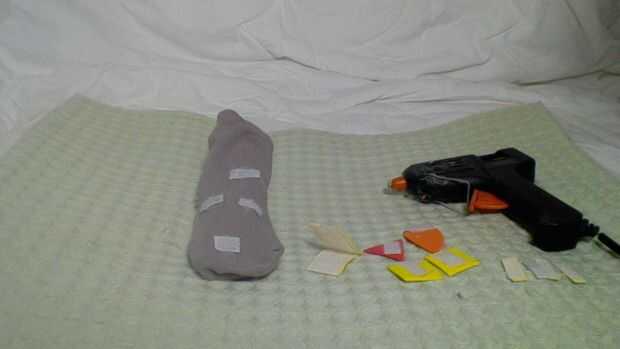 Cortar 4 tiras de velcro, velcro tiene dos caras. Coloque el lado grueso del velcro en el calcetín y el lado suave a cada pieza, asegúrese de ser coherente!