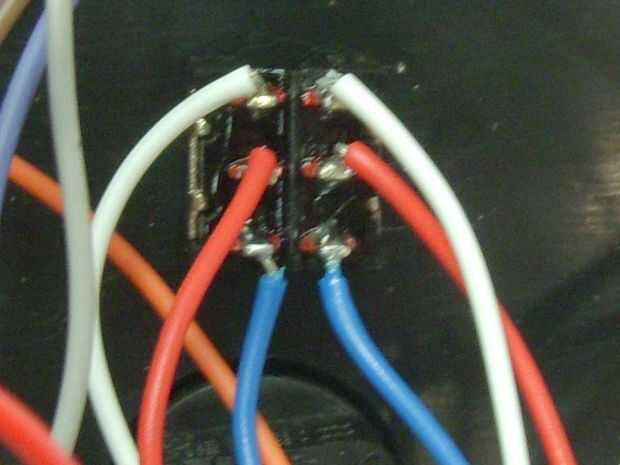 3) en la parte posterior del interruptor blanco complemento émbolo hay tres lengüetas de la soldadura. Soldar un cable rojo a la etiqueta un 'cerrado'.