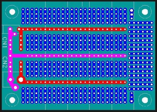 Cada tira de azul conecta todos los pads de contacto. Así que si conectas un alfiler hilo o encabezado a una almohadilla, se conectará eléctricamente a todos los otros contactos contiguos en la misma franja de color.