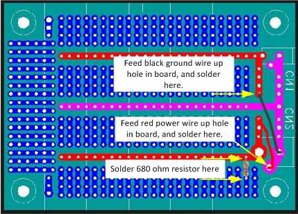 4) Inserte el resistor de 680 1/4 Watt en circuito en la posición mostrada en la imagen. Un extremo se conecta al bus de alimentación. Al otro lado de la resistencia se conecta al segundo contacto de la parte superior de uno de los botones de contacto azul como se muestra.